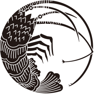 | 海老紋とは、伊勢海老を図案化した家紋。海老は正月の飾りやおせち料理にも欠かせないようにめでたい生き物で、長い髭と曲がった尾が腰が曲がるまで長生きすると長寿の象徴として、古くから吉祥の動物とされ珍重された。吉祥的な意義で家紋となった。 |