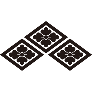 三つ盛り菱に花菱紋は、3つの『菱に花菱』を山積みにして3つ盛りに描く。