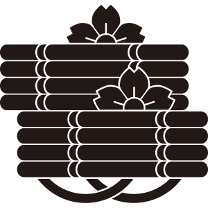 二つ花筏紋は、4本の木材を組んだ2枚の『筏』を上下にずらして並べ、2つの山桜の花を筏から覗くように描く。