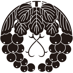 下り葡萄紋は、左右から葡萄の房を垂らし、3枚の葉を上につけて、中央に2本の蔓を交差させて『下り藤』に見立てて描く。葡萄紋の中でも代表的な家紋。