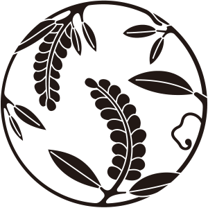 | 藤紋は、山野に自生するマメ科の蔓性落葉木本である藤の葉と花を紋章化した家紋。藤は寿命が長く、繁殖力が強いことでめでたい植物とされ、「万葉集」にも数多く詠まれて詠まれている。そのため、紋章としても好まれ、織物などにも盛んに描かれた。藤紋の使用家は、栄華を極めた藤原氏が圧倒的に多いが、その名声にあやかって藤紋を採用する家も増えたため、藤紋を使用しているからといって、必ずしも藤原氏族であるとは断定できない。 |