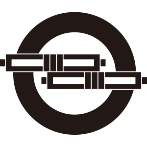 太輪に引き違い筒守紋は、2本の『筒守』を左右にずらして上下に並べ、その下に太輪を描く。