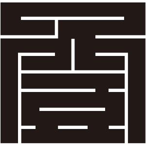 | 角字紋は文字紋の一種で、正方形の中に曲線を用いずに描かれる。文字紋は文字を紋章化したもので、家々で独自に設定され用いられることも多く、バラエティに飛んでいる。 |