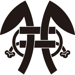 紐結び二つ鎌紋は、2本の鎌を刃が外側を向くように並べ、さらに紐でからめた形で描く。