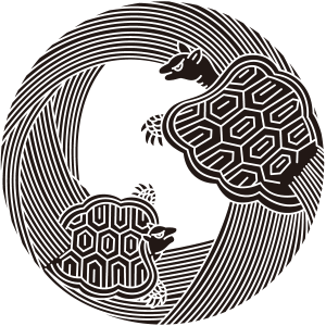 | 亀紋とは、蓬莱山にすむという霊亀を図案化した家紋。亀は古くから長寿を象徴する動物で、家紋として描かれる亀には長い毛と耳が生えているものが多く、紋章では蓑亀(ミノガメ)と呼んでいる。文様としても古くから用いられているが、家紋となったのは比較的に新しく、江戸時代以降が多い。長寿など瑞祥的な意義で用いられた。 |