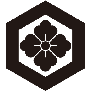 一重亀甲に花角紋は、『一重亀甲』を描いて、その中心に『花角』を添える。大和小泉藩片桐氏の家紋の一つ。