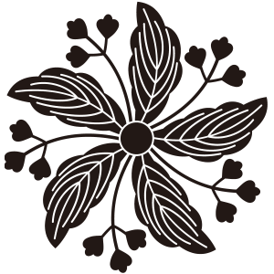 | 桐はアオギリ科の落葉広葉樹。鳳凰が住む嘉木とされる梧桐(あおぎり)に由来する家紋だが、デザイン的には別種の白桐が元となっている。もともと天皇家の紋章だが、功を挙げた臣下に賜与されることにより次第に広まっていった。梅、藤、木瓜、片喰とともに五大家紋の一つ。 |