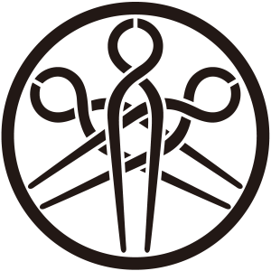 中輪に三つ違い釘抜紋は、『閻魔釘抜』を3本、頭を上に向けて交差させ、その周りを中くらいの太さの丸(中輪)で囲う。