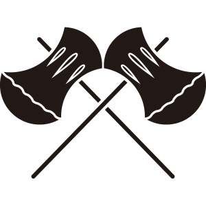 | 鉞は大型の斧のこと。鉞は古代中国の皇帝の権威の象徴であり、日本でも東国征伐に向かう日本武尊(ヤマトタケルノミコト)に天皇自ら鉞を授けたことが日本書紀に記されている。家紋としては尚武的な意義によるもの。 ちなみに鉞は魔除けとして表に三本、裏に四本の筋があり七つ目という。 |