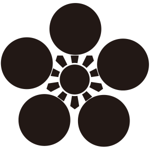大聖寺梅鉢紋は、『梅鉢紋』の5枚の花弁と花弁の間に蘂を丁字にかたどったものをつける。越中富山藩前田氏の家紋。別名『瓜実梅鉢』。防府市防府天満宮の神紋。